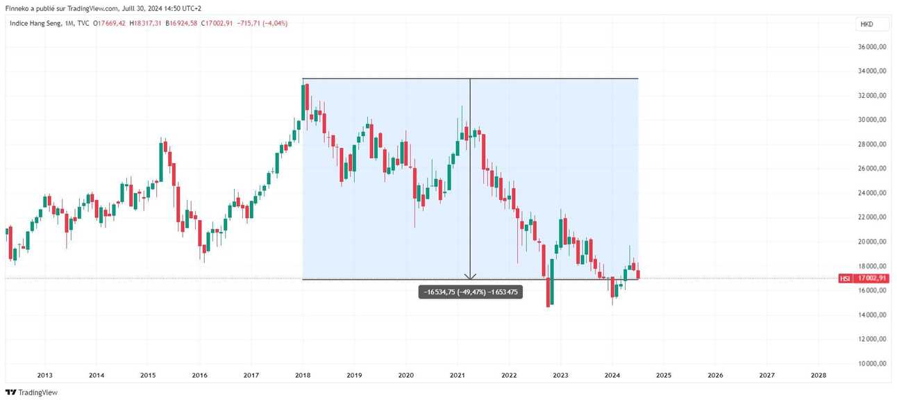 Le Hang Seng Index, indice boursier de référence sur le marché chinois, est sans appel : il corrige de près de 49% entre son « top » de janvier 2018 et aujourd’hui.
