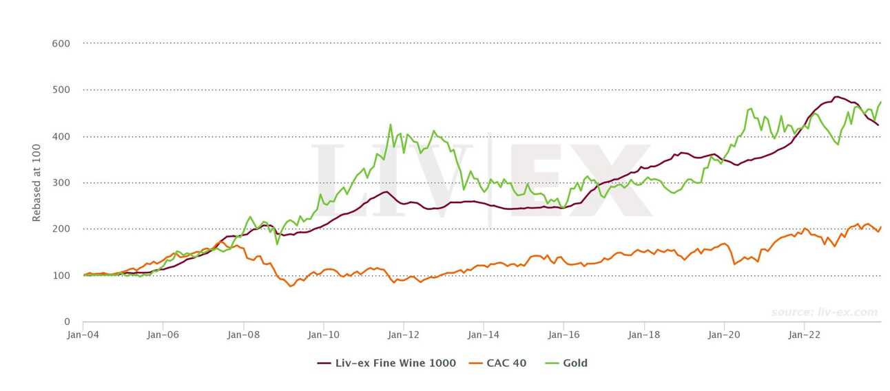 🔍 Il est également intéressant de préciser que le vin est un actif résilient et décorrélé des marchés financiers. Vous trouverez ci-dessous un graphique comparatif sur les 20 dernières années entre l’indice du Liv-ex Fine Wine 1000, le CAC 40 et l’Or.