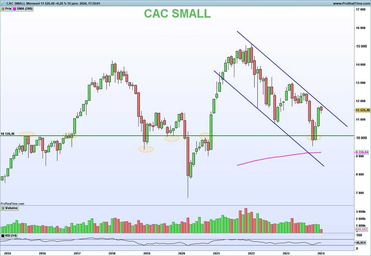 Techniquement parlant, l’indice small cap est baissier en tendance long terme. Pour inverser la tendance, le canal baissier long terme devra être cassé par le haut.