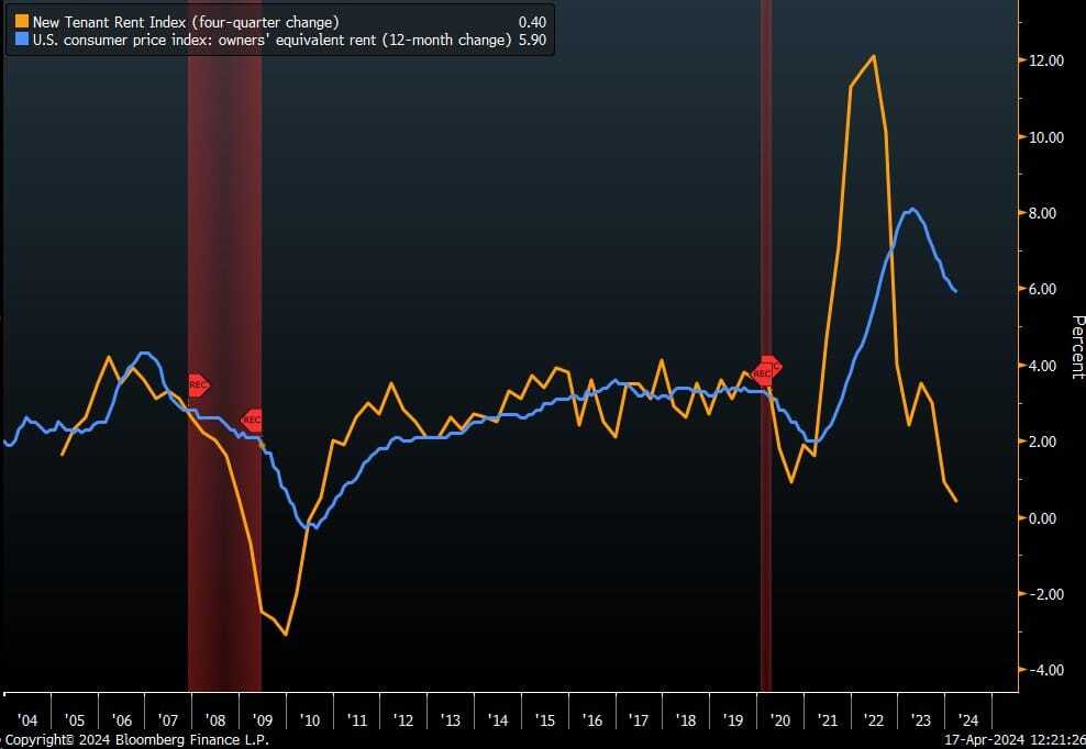 Indices des nouveaux loyers (orange) vs composante loyer de l’IPC des Etats-Unis (bleu) / Source : @boes_
